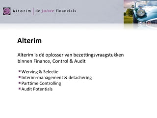 Alterim Alterim isd é oplosser van bezettingsvraagstukken binnen Finance, Control & Audit Werving & Selectie Interim-management & detachering Parttime Controlling Audit Potentials