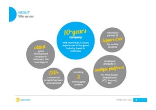 This document provides an overview of a game development company in Indonesia called Altermyth. It summarizes that Altermyth has over 13 years of experience in the game industry and has developed over 130 commercial projects for clients in Indonesia and overseas. It also details the services Altermyth provides, including game development, publishing, and operating an app store for the Indonesian market. The company's vision is to develop successful and impactful original game IPs for both global and local audiences.