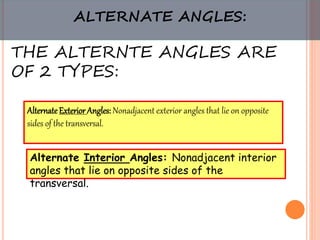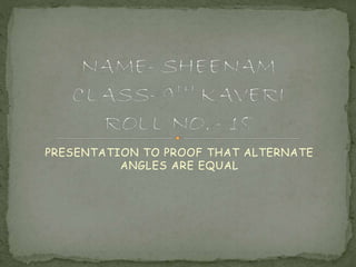 The document presents a proof that alternate angles are equal. It defines two types of alternate angles: alternate interior angles and alternate exterior angles. It gives an example of two lines intersected by a transversal line to represent the angles. The proof uses vertically opposite angles and corresponding angles properties to show that alternate interior angles are congruent. It also asks to identify angle relationships and find values of variables in examples of alternate exterior and interior angles.