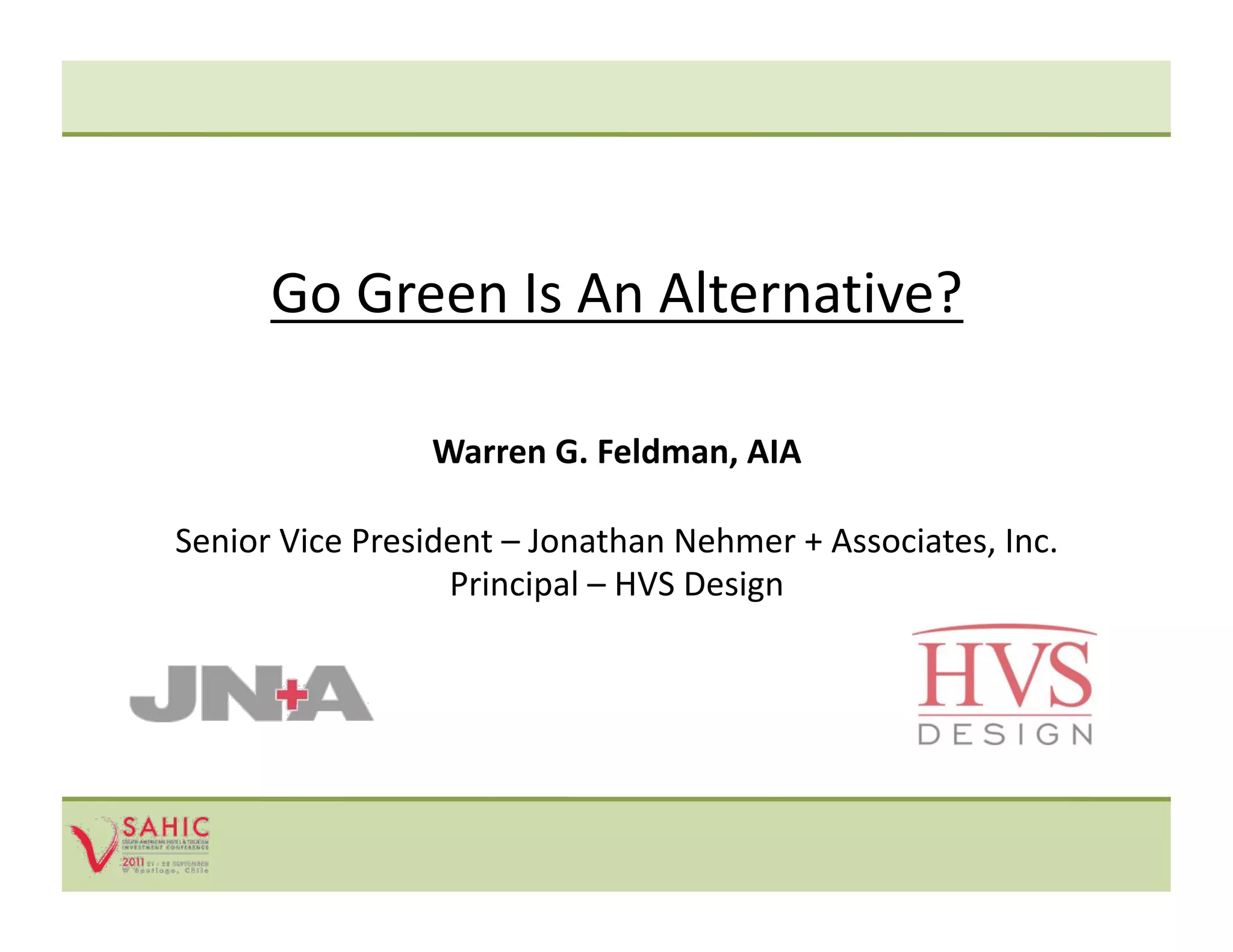 This document discusses going green and LEED certification for hotels. It outlines the LEED credit categories and certification levels. It acknowledges some of the challenges of green building, such as cost and difficulty of implementation. However, it argues that green building is becoming standard practice as governments and companies increasingly mandate or incentivize sustainability requirements for new construction. Some examples of incorporating sustainable design elements into hotel projects are provided.