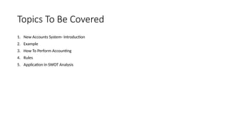 This document presents an alternative accounting method designed to enhance financial tracking within an entity, simplifying the recording process and making it accessible even for individuals without accounting backgrounds. It outlines a new account system, accounting processes, rules for proper accounting practices, and applications in SWOT analysis, all aimed at improving efficiency in finance management and tax filing. The method emphasizes a structured approach to recording transactions while ensuring clarity in profit and loss calculations.