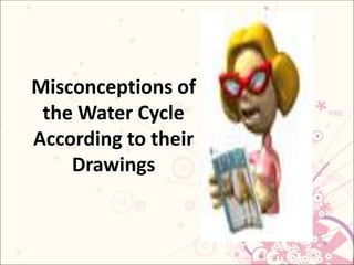 This document summarizes a study that investigated students' alternative conceptions about the water cycle through drawings and interviews. The study involved undergraduate science students with an average age of 21. Students were asked to draw the water cycle and were classified based on the level of understanding shown in their drawings. Individual interviews were then conducted. Common alternative conceptions identified included thinking the water cycle only involved freezing/melting, only evaporation and condensation, or that water only evaporates from seas and oceans. The scientific understanding of the full water cycle process is also provided.