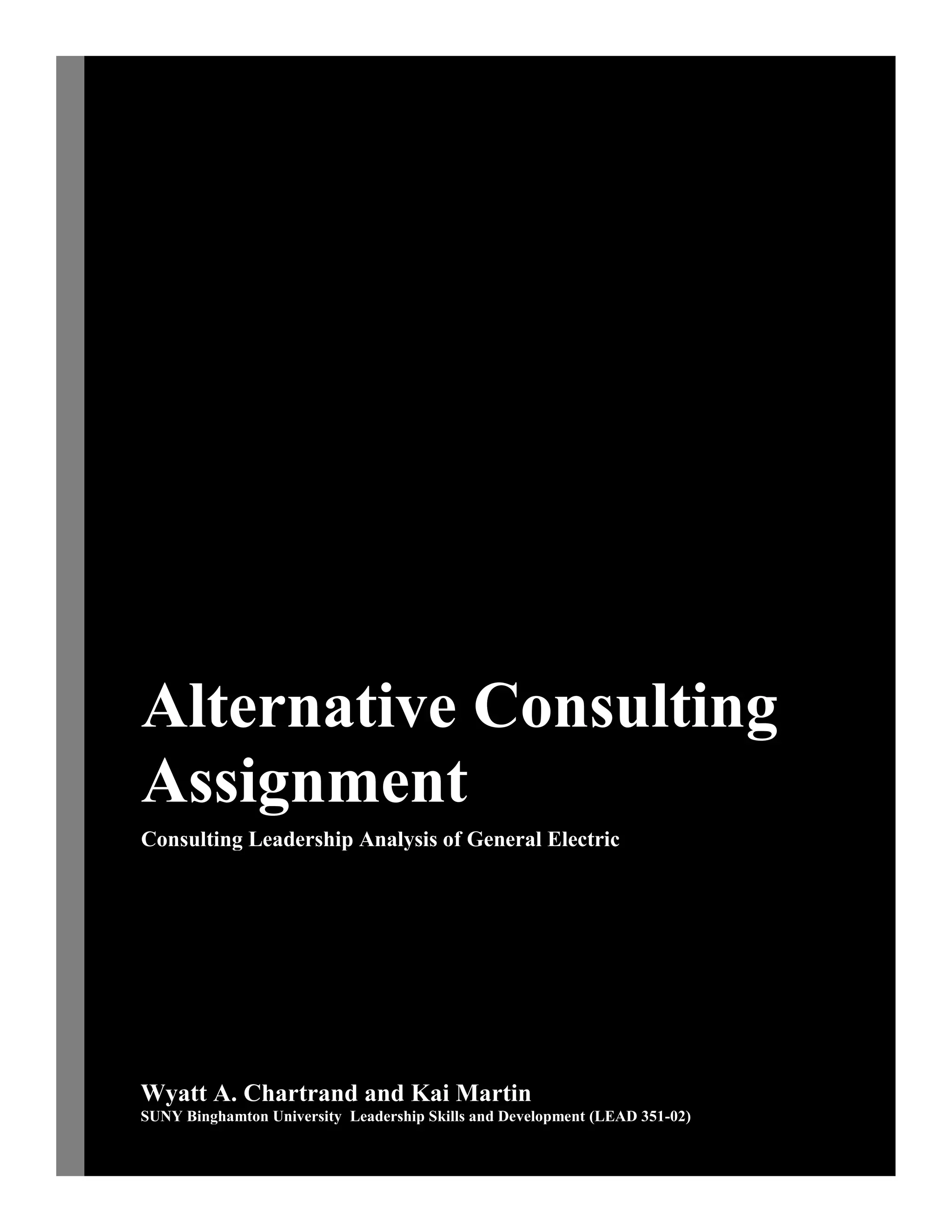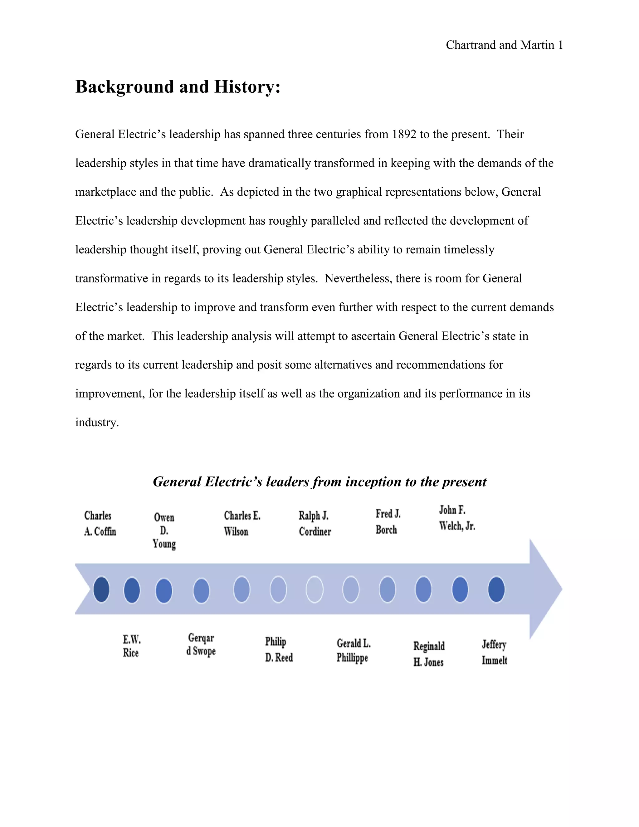 This document analyzes the leadership of General Electric from 1892 to the present. It provides background on GE's leadership development and styles over time. The analysis then focuses on the leadership of current CEO Jeffrey Immelt since 2001. It describes his strengths, including navigating challenges and focusing on innovation. Some criticisms of Immelt are also outlined, such as stock performance not reaching levels under former CEO Jack Welch. The document concludes with recommendations for Immelt to adopt a "fusion" leadership style combining transformational and autocratic leadership, with a renewed focus on ethics and operational excellence.