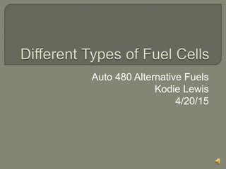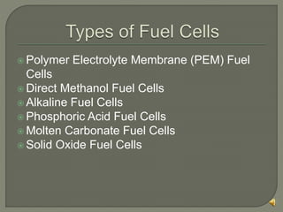 This document discusses 6 types of fuel cells: polymer electrolyte membrane fuel cells, direct methanol fuel cells, alkaline fuel cells, phosphoric acid fuel cells, molten carbonate fuel cells, and solid oxide fuel cells. For each type, it covers their operation, applications, advantages, and disadvantages. It concludes that polymer electrolyte membrane fuel cells and alkaline fuel cells currently show the most potential for transportation applications, and that fuel cells could be a viable alternative power source for vehicles with further technological advances.