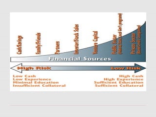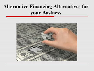 This document discusses alternative financing options for small businesses. It covers bootstrapping using internally generated funds, angel investors who are high-net-worth individuals interested in emerging businesses, institutional venture capital firms looking for high returns, commercial banks that typically lend for assets and require collateral, the Small Business Administration that helps with longer term loans, and creative options like peer-to-peer lending, factoring accounts receivable, merchant financing using credit card sales, vendor financing from major customers, and crowdfunding by raising small amounts from many people online. The key is finding the right option based on the business needs, creditworthiness, and ability to repay loans.