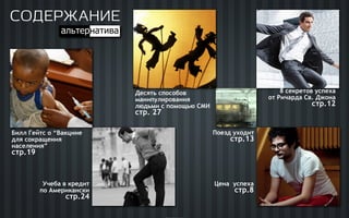 В журнале 'Альтернатива' за июнь 2011 года обсуждаются темы манипуляции через СМИ и важность самосовершенствования. Автор подчеркивает необходимость активных действий для достижения успеха и предлагает использовать метод предсказания будущего на основе прошедших 30 дней активности. Также затрагиваются примеры лидеров и движения, показывающие, как можно изменить мир через инициативы и сплочение единомышленников.