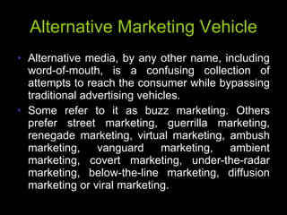 The document discusses various alternative marketing techniques including viral marketing, word-of-mouth marketing, blogging, video games, mobile marketing, and sponsorship/events. It provides examples of how companies have used these techniques successfully, such as Ford's product seeding campaign during the MTV Video Music Awards. It also discusses factors that make word-of-mouth and viral marketing effective, such as the ability to deliver personalized marketing messages through social networks.