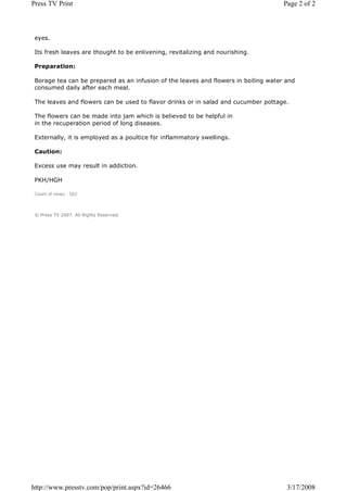 Borage is an annual plant native to Europe that is used in alternative medicine. It contains nutrients like potassium, calcium, and vitamin C. Medicinally, it is used to treat stress, anxiety, insomnia, lung complaints, fever, jaundice, and eye inflammation. Borage tea can be made from the leaves and flowers and consumed after meals. The flowers can also be made into jam to aid recovery from illness. Excess use may lead to addiction, so borage should be used in moderation.