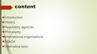 This document discusses alternative methods to animal toxicity testing, including in silico computer simulation methods, in vitro cell culture techniques, using fewer animals, microdosing, and epidemiological and clinical studies. It provides details on regulatory agencies that promote alternative testing methods, as well as specific alternative tests that have been developed and validated according to OECD guidelines to replace or reduce animal use.