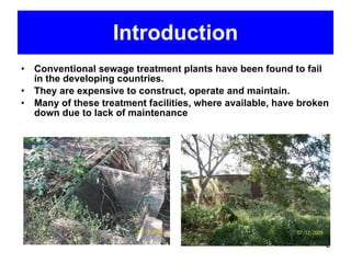 The document discusses the effectiveness of using water hyacinth (Eichhornia crassipes) as a constructed wetland (CW) for treating domestic sewage, highlighting its viability and cost advantages over traditional treatment methods. It reports significant reductions in sewage quality parameters such as color, turbidity, biochemical oxygen demand (BOD), nitrate, phosphate, and E. coli over a 24-week period, achieving up to 100% color removal and 99.66% E. coli removal. The findings suggest that water hyacinth-based treatment systems are not only effective but also economically beneficial for developing regions facing sewage management challenges.