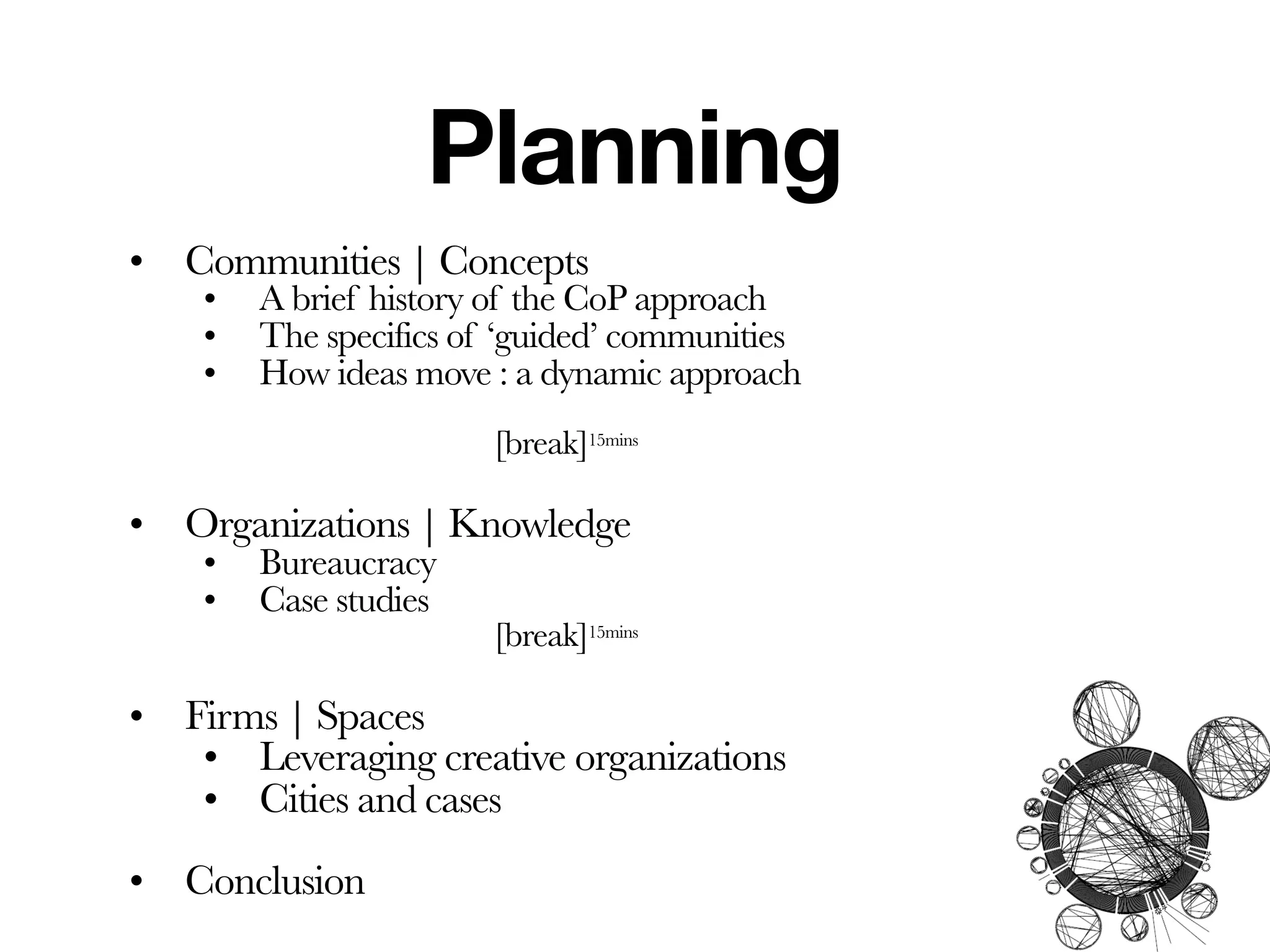 The document explores alternative structures of knowledge management through a community-of-practice (CoP) approach, emphasizing the dynamics of learning and collaboration within organizations and cities. It contrasts intentional CoPs, created through formal hierarchies, with spontaneous ones, highlighting the importance of fostering environments that encourage emergence and creativity. Various case studies involving prominent firms demonstrate the challenges and potential benefits of implementing CoPs in different contexts.