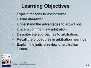 This document summarizes alternatives for resolving legal controversies such as mediation and arbitration. Mediation uses a third party to help the disputing parties reach a compromise agreement. Arbitration involves submitting a dispute to a third party arbitrator who makes a binding decision. Most states have arbitration statutes that make pre-dispute arbitration agreements irrevocable and enforce arbitration awards. Courts give deference to arbitration awards and will not overturn them due to ordinary legal errors by the arbitrator.