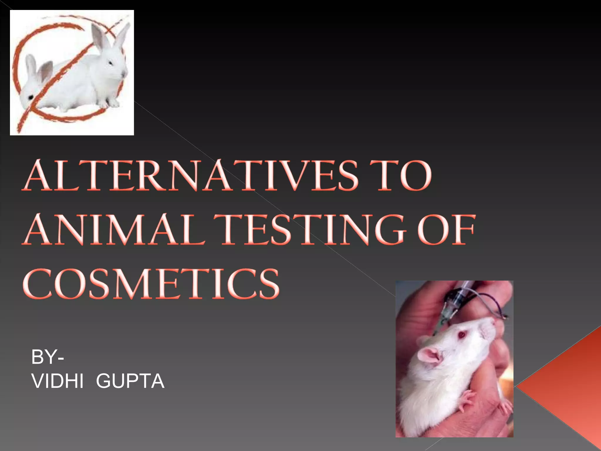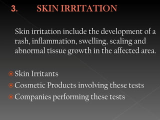 Animal testing is commonly used for safety testing but causes harm to animals. Non-animal testing methods provide alternatives like using synthetic membranes and human cell cultures to assess skin corrosion and absorption without harming animals. These alternative methods are becoming more widely used and accepted in the cosmetics industry for tests like skin irritation and phototoxicity testing.