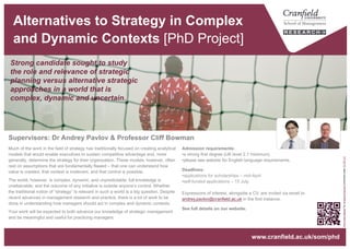 The document outlines admission requirements for a PhD project focused on alternatives to traditional strategy in complex and dynamic contexts, emphasizing the need for a strong academic background and English proficiency. It questions the relevance of conventional strategic models given the unpredictable nature of the world and calls for research that will benefit both academic understanding and practical management. Interested candidates should submit expressions of interest along with their CV via email by mid-April.