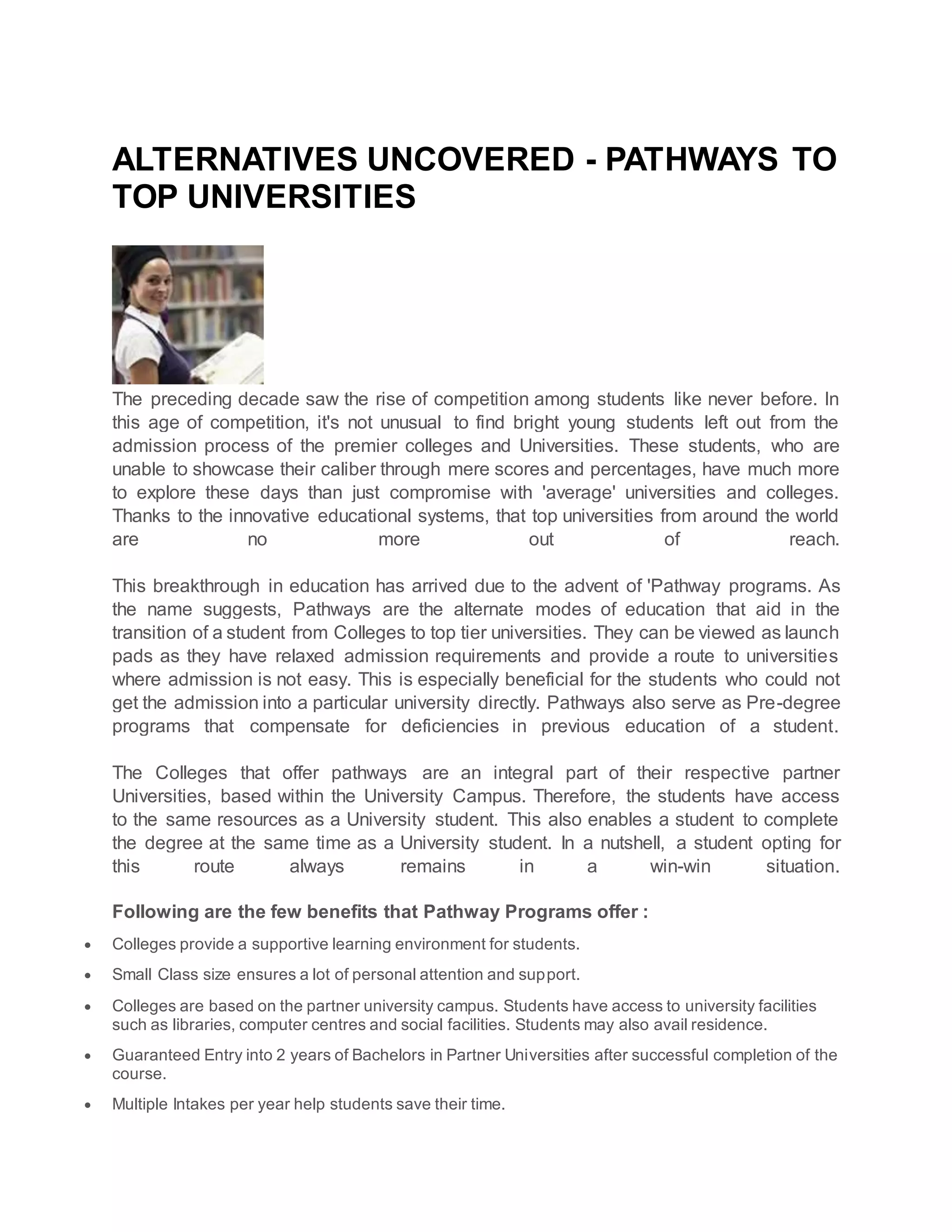 The document discusses pathway programs that provide an alternative route for students to gain admission to top universities. These programs have more relaxed admission requirements and allow students to transition to their partner universities after completion. The pathways are offered through colleges that are an integral part of and located on the campuses of their partner universities. Students in pathway programs have access to the same resources as university students and can complete their degrees at the same time. The pathways offer benefits like a supportive learning environment, small class sizes, guaranteed university entry after completion, and multiple intake opportunities each year.