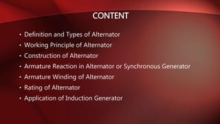 An alternator is an electrical generator that converts mechanical energy to electrical energy. It uses a rotating magnetic field with a stationary armature. The working principle relies on Faraday's law of electromagnetic induction. As the armature rotates within the magnetic field, an alternating current is produced. The main components are the stator with stationary armature windings and the rotor with a rotating magnetic field supplied by a DC current. Armature reaction causes the magnetic field to be distorted by the armature current. Alternators have various applications including in automobiles, power plants, and for providing regenerative braking in induction motors. Induction generators can also be used to convert the rotational energy of windmills into electrical energy.
