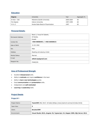 Mohamed Althaf seeks a challenging career in IT with an organization where he can utilize his 11 years of experience in software development using Microsoft technologies. He has expertise in analysis, development, implementation, testing, and customer support. His technical skills include C#, ASP.NET, AngularJS, SQL Server, and Visual Studio. He has worked on projects in various domains and aims to contribute his strong communication and problem-solving abilities.