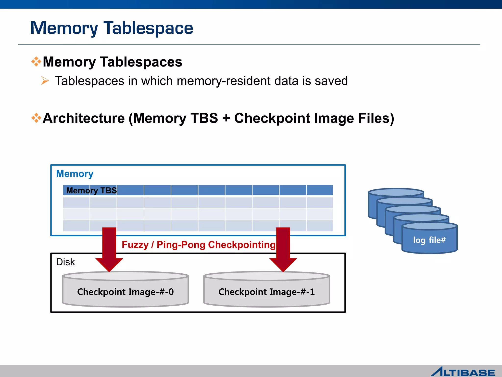 Memory tablespaces store memory-resident data and use checkpoint image files on disk to recover that data if needed. Space in a memory tablespace is allocated in 32KB pages that have a status of either free or used. When data is deleted from a table, the empty pages' status changes to free within that table but they are not returned to the tablespace until compaction. Truncating a table returns all its pages to the tablespace as free.