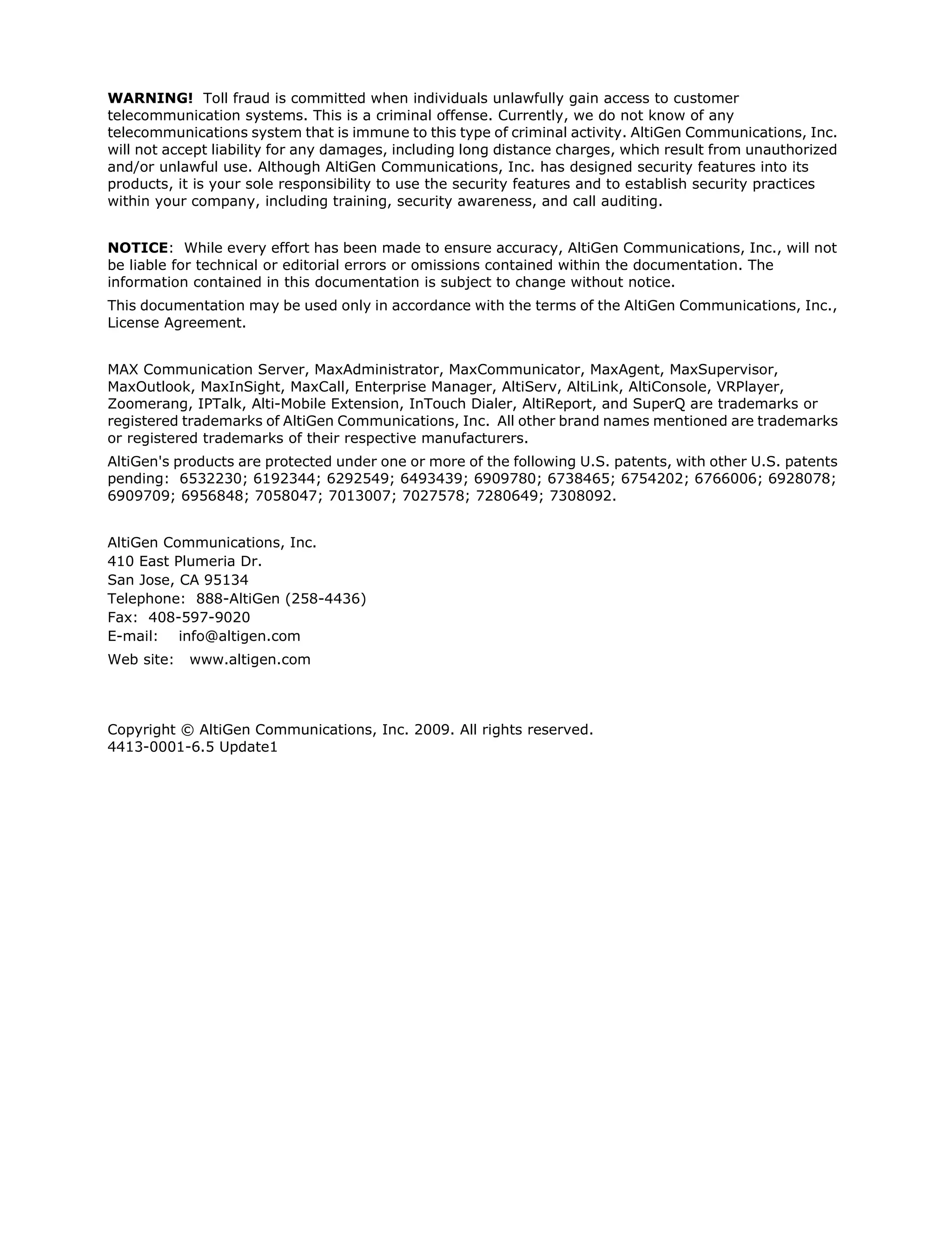 This document is the administration manual for Max Communication Server ACM 6.5 Update 1, detailing system features, installation requirements, and configuration guidance. It warns of toll fraud and emphasizes the importance of implementing security measures and practices by users. The document also lists trademarks and contains patent information related to Altigen Communications, Inc.