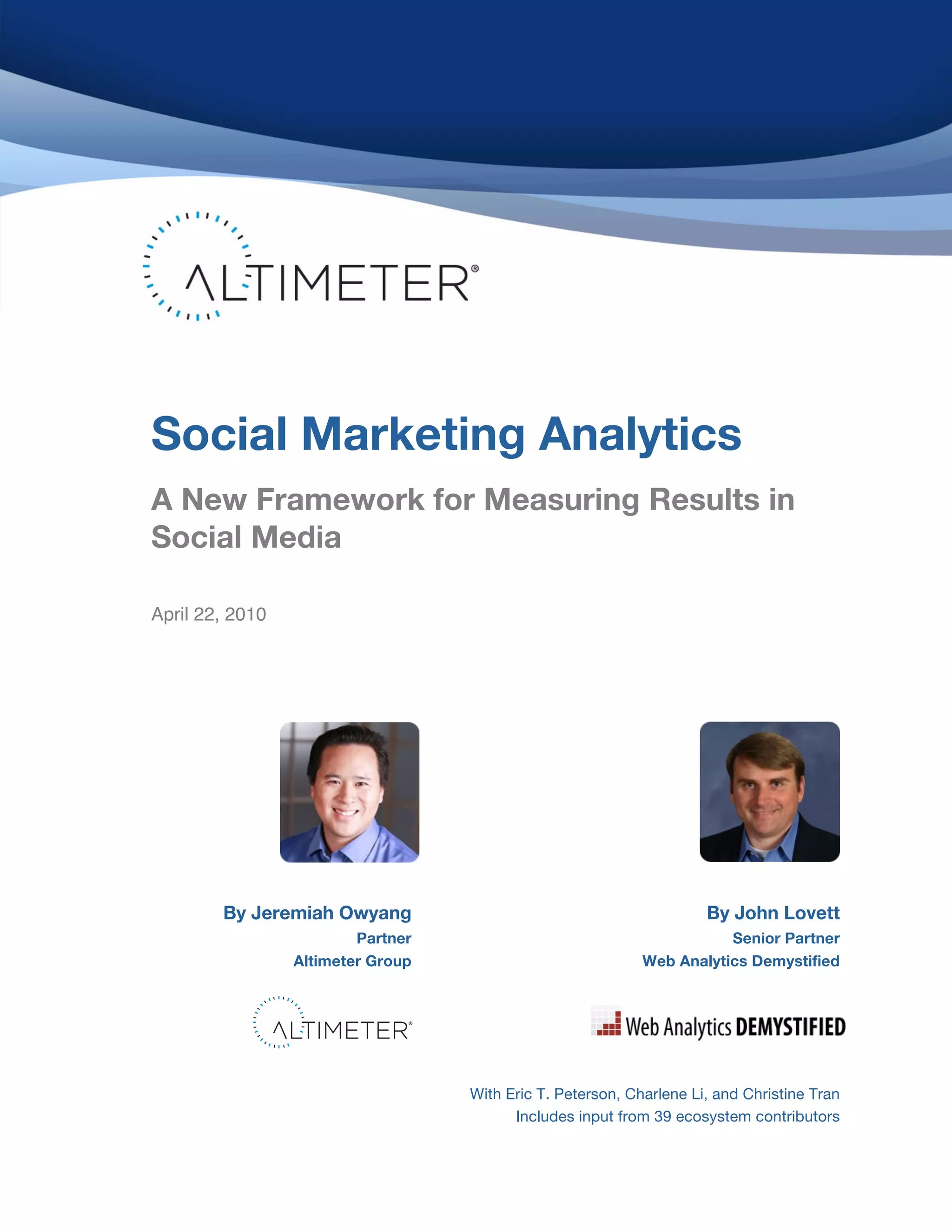The document discusses the necessity for businesses to adopt a measurement framework for social media marketing due to the rapidly evolving digital landscape. It highlights that many organizations lack effective measurement strategies, which can jeopardize customer relationships, and stresses the importance of developing standardized metrics. Through research, the authors outline a structured approach to social marketing analytics, encouraging businesses to define objectives, select appropriate vendors, and create customized measurement playbooks to enhance their social media initiatives.