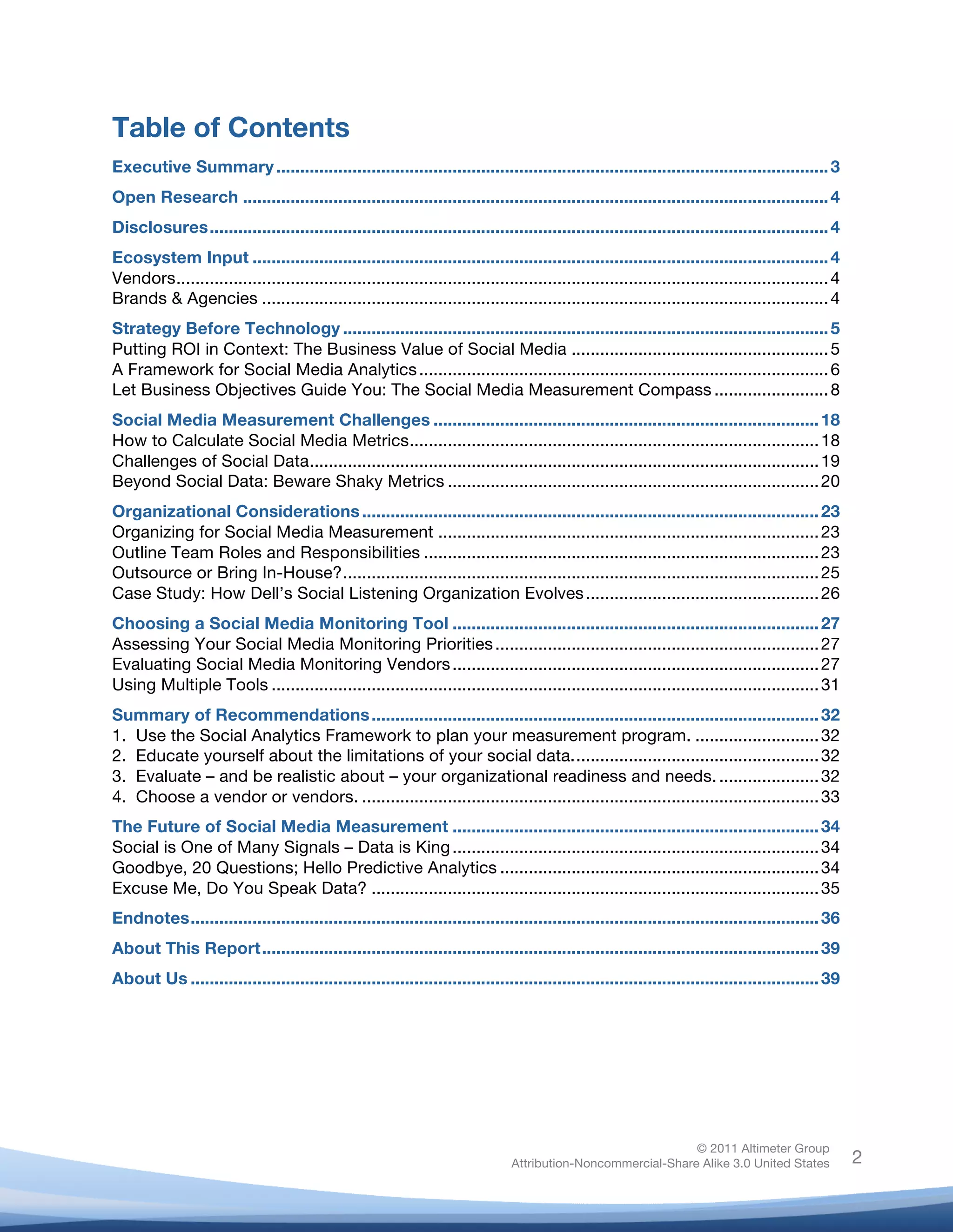 This document provides a framework for social media analytics including six use cases. It outlines challenges in social media measurement and recommendations. The framework includes aligning social strategy with business objectives, determining metrics, evaluating organizational readiness, and choosing tools based on strategy, metrics and needs. Key use cases covered are brand health, marketing optimization, customer care, product development, recruitment and internal communications. The document provides sample metrics, insights and actions for each use case.