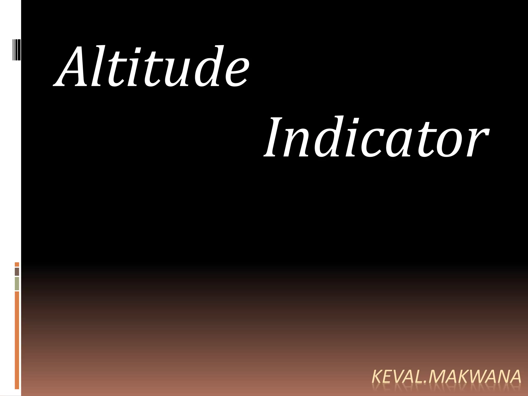 The attitude indicator uses a gyroscope to display the orientation and bank angle of an aircraft relative to the Earth's horizon. It shows pitch and bank on a display divided into blue sky and brown ground colors. The instrument remains level with gravity and may develop small errors over long flights or high acceleration. Pilots use it to view a miniature airplane symbol and horizon bar separating the sky and earth representations, along with degree indices marking the bank angle.