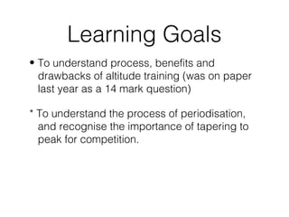This document discusses altitude training and periodization. Altitude training involves living or training at high altitude to improve endurance performance through increased red blood cell concentration upon returning to sea level. The process involves acclimatization, primary training at altitude, and recovery upon returning to sea level. Problems with altitude training include physiological stresses and the disruption to an athlete's normal training. Periodization involves planning training in cycles to optimize performance and avoid overtraining. It includes tapering training loads before events to allow the body to peak and supercompensate.