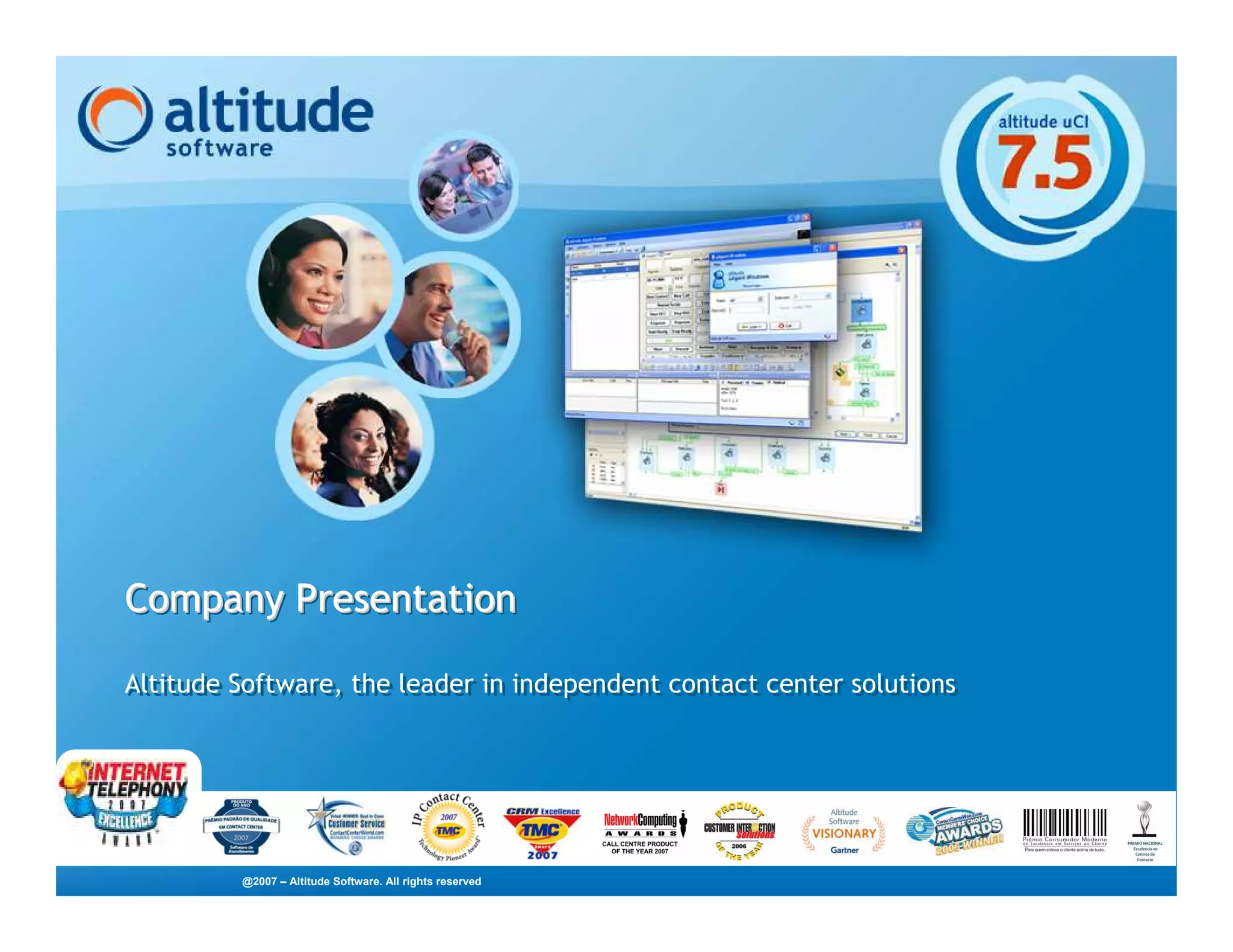 Altitude Software is a leading provider of independent contact center solutions. It offers a unified customer interactions (uCI) suite built on a single architecture allowing integration of modules for contact center responsibilities. The suite provides infrastructure independence, a single administration interface, and language. Altitude is committed to customer freedom of choice, embracing change, and peace of mind. It has a global presence with offices in 15 countries and over 700 installations worldwide.