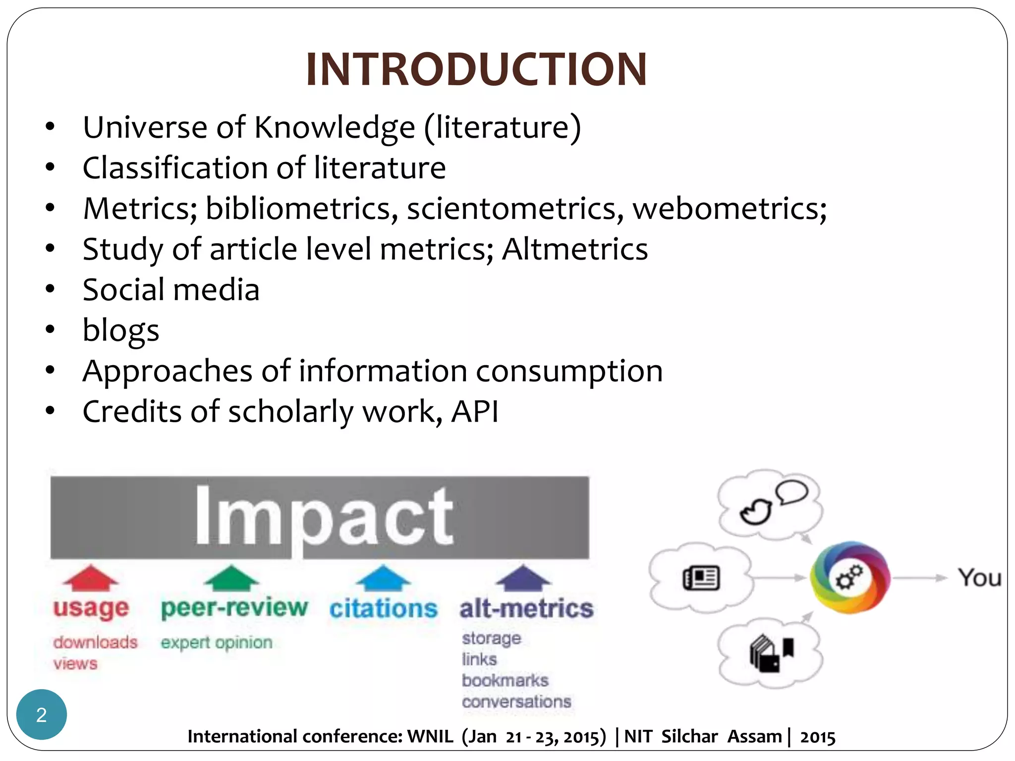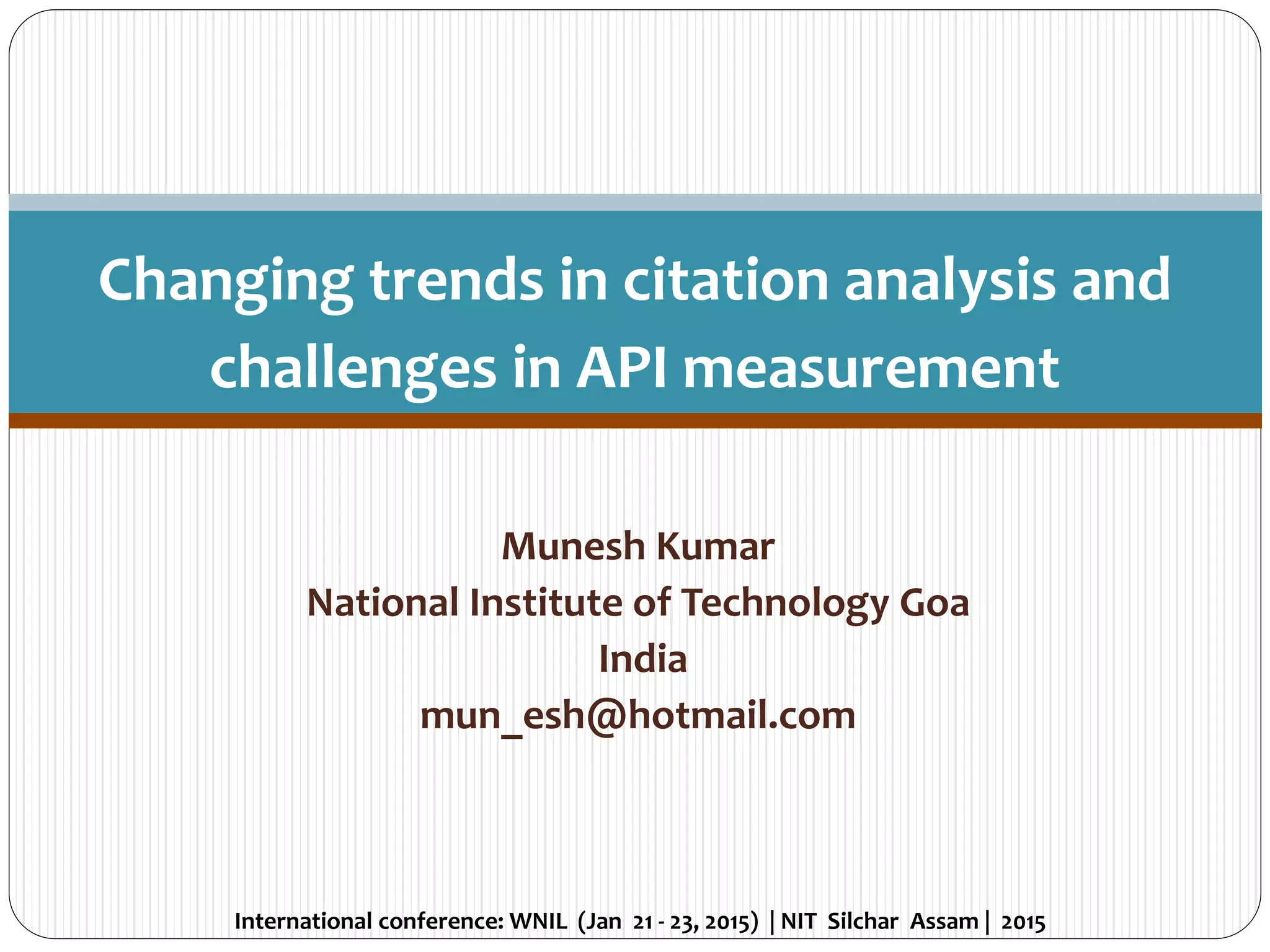 The conference focused on changing trends in citation analysis and the challenges of altmetrics, discussing various data sources and measurement tools, including Scopus and Twitter. Key topics included the importance of altmetrics in research, methodologies for analysis, and future integration into academic metrics. Challenges in API measurement and the need for standardized norms in citation practices were also highlighted.