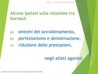 Il documento analizza le condizioni di rischio di burnout negli atleti di alto livello, evidenziando fattori come sovrallenamento, perfezionismo e motivazione. Viene sottolineata l'importanza della qualità dell'autodeterminazione nell'affrontare l'insorgere del burnout, con differenze significative tra motivazione intrinseca ed estrinseca. Infine, si distingue tra sovrallenamento e burnout, con quest'ultimo caratterizzato da esaurimento emotivo e un impatto severo sulla vita dell'atleta.