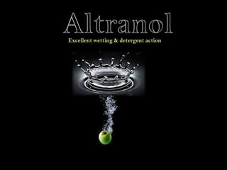 The document discusses how surfactants like ALTRANOL can be used to control liquid spreading on surfaces by reducing surface tension. Surfactants act as wetting agents by lowering the interfacial tension between different materials like water and oil or stains. Specifically, non-ionic surfactants like ALTRANOL are resistant to hard water degradation and are excellent at removing stains since they do not have an electric charge.