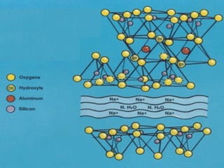 The document discusses the use of minerals, particularly clays, in the textile industry. Clays have properties that make them useful for applications like thickening agents, absorbing oils and dirt, and stabilizing hydrogen peroxide bleaches. One new application is a clay-based product called Altranol-GEO, which can be used for discontinuous bleaching of cotton with hydrogen peroxide. Altranol-GEO provides hydrogen peroxide stabilization, good wetting of fabric, lubrication, and is environmentally friendly. Test results showed it reduced BOD and COD levels in wash effluent and provided softer fabric handles compared to standard bleach processes.