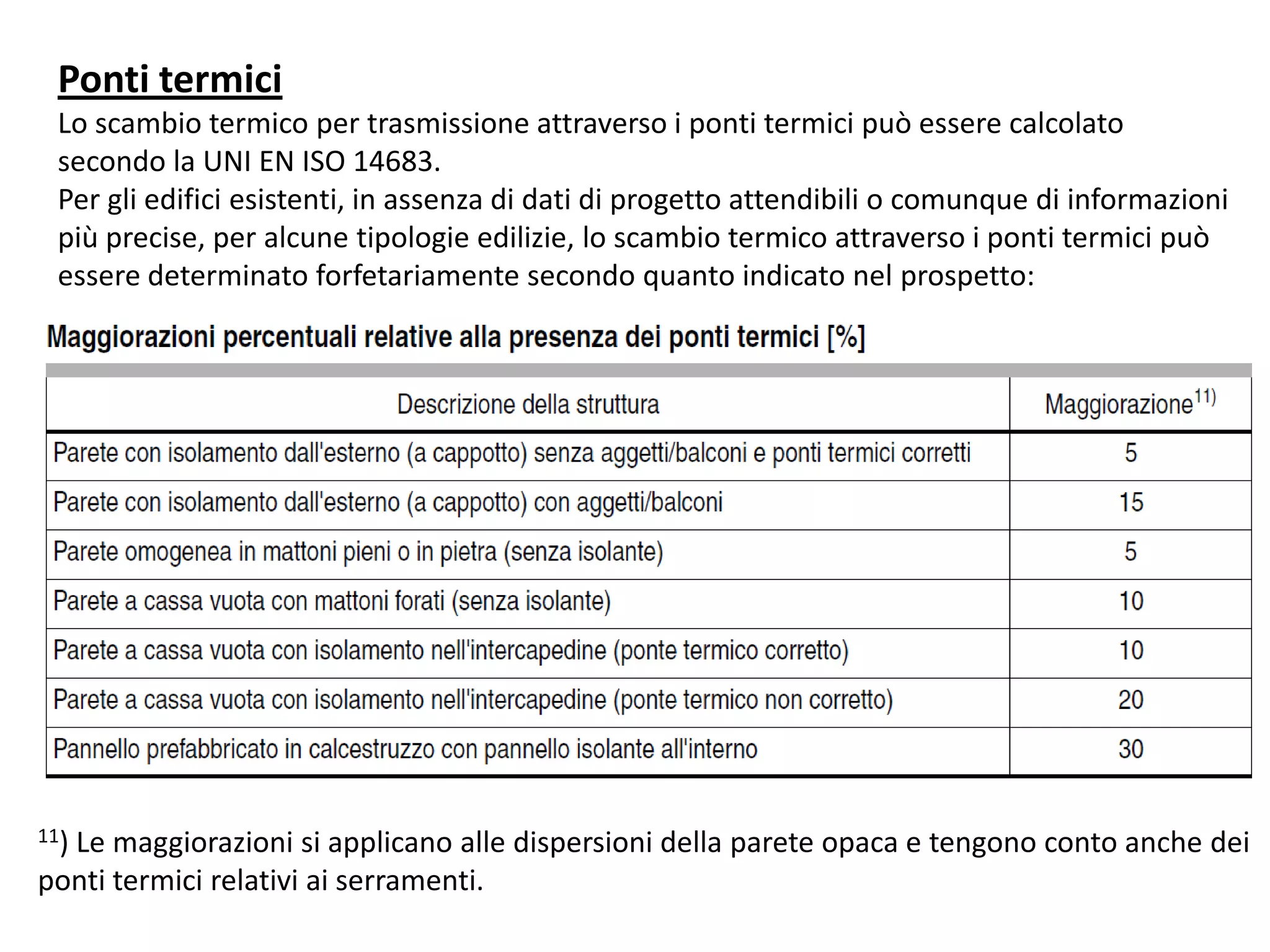 Il documento descrive il calcolo dello scambio termico attraverso i ponti termici secondo la norma UNI EN ISO 14683 per edifici esistenti. Si forniscono indicazioni su come determinare forfeitariamente lo scambio termico quando mancano dati di progetto e si specificano i coefficienti di scambio termico tra ambienti climatizzati, non climatizzati ed esterni, nonché verso il terreno secondo la UNI EN ISO 13370. Inoltre, vengono presentati i fattori di correzione e i criteri per il calcolo della trasmittanza termica.
