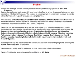Altron Security Engineering Pvt. Ltd. is an ISO 9001:2008 certified company that provides safety and security systems in India and overseas. They have over a decade of experience and a team of over 50 professionals. They offer a wide range of security products and services including CCTV surveillance, fire alarm systems, access control, and more.