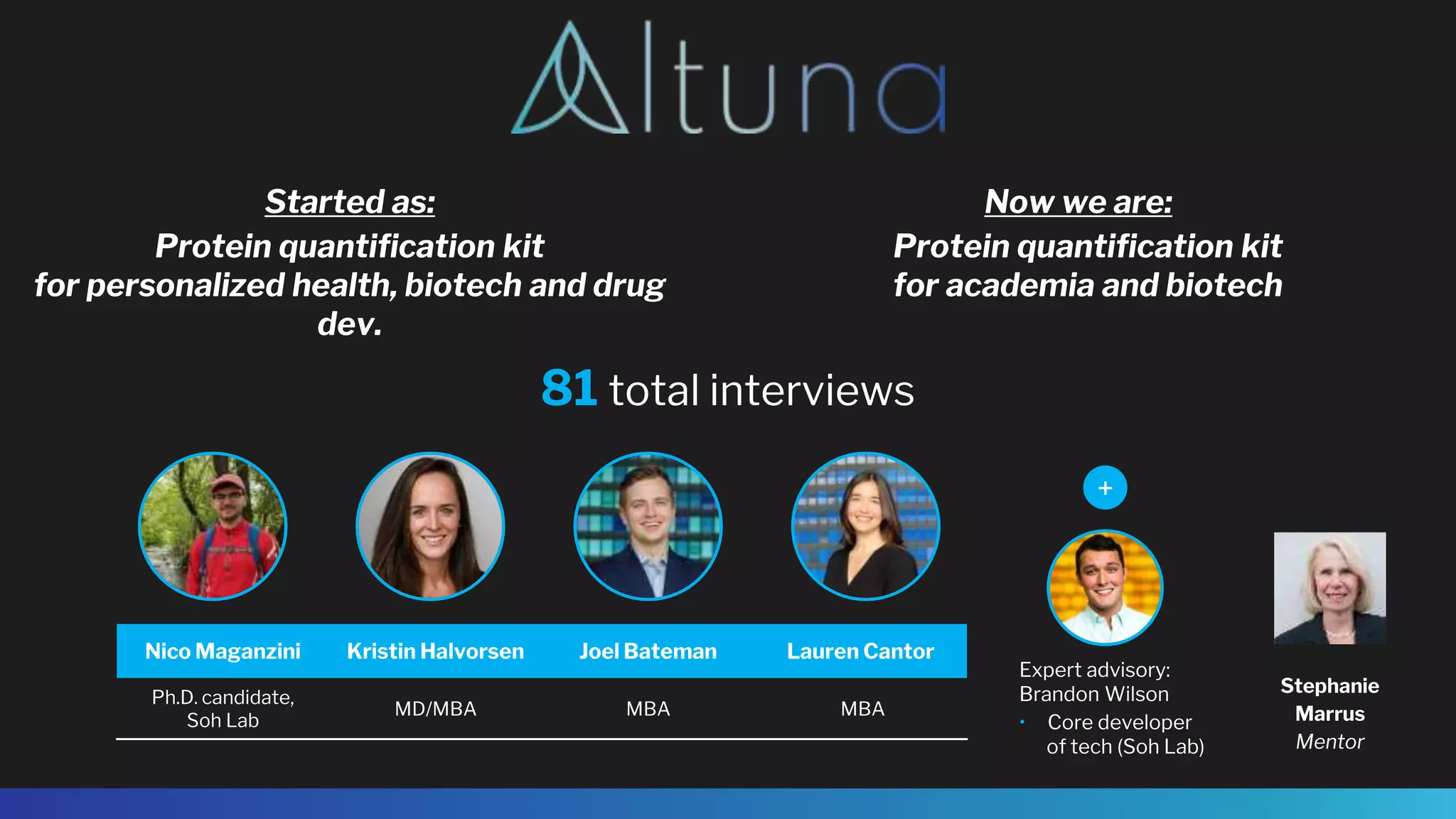The document describes a team's efforts to commercialize a new protein quantification technology called PLA-Seq. After initially thinking the technology's value propositions of lower cost, faster throughput, and lower sample volume would appeal to pharmaceutical and personalized health companies, the team conducted customer interviews and learned accuracy was more important than cost to most customers. They also found their target markets should be preclinical biotech and academia rather than personalized health or CROs. The team incorporated their business and pivoted their marketing strategy and funding plans accordingly based on learnings outside of the building.