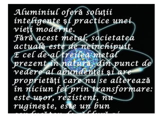 Aluminiul, un metal alb-argintiu cu proprietăți remarcabile, este abundent în natură și are aplicații variate. Poate fi extras din bauxită și are o conductibilitate electrică superioară, fiind utilizat pe scară largă în industrie. Noutăți recente includ aluminiul transparent obținut prin impulsuri laser și utilizarea sa în producerea de hidrogen.