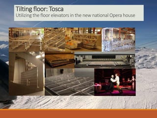 This document discusses examples of work with aluminum structures including a tilting floor for an opera house, aviation maintenance work platforms, and rooftop, stairway, and outside platforms for the Lynetten CPHG building. The work highlights a change from traditional scaffolding to more compact, mobile, flexible and height-adjustable solutions.
