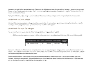 1) Businesses that need large quantities of aluminum in the future can implement a long hedge in the aluminum futures market to lock in a purchase price and protect against rising aluminum prices.