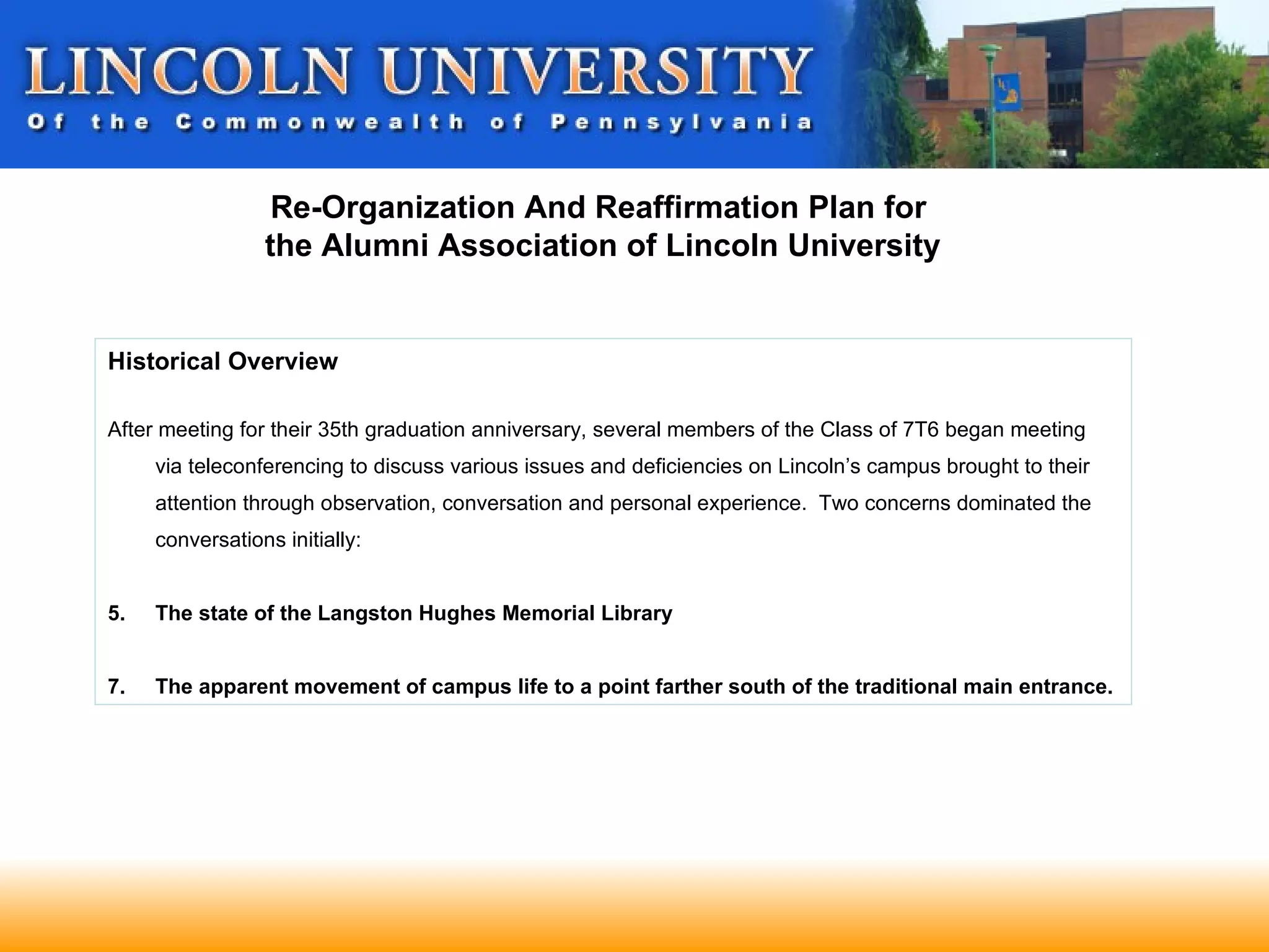 The document outlines a reorganization and reaffirmation plan for the Alumni Association of Lincoln University (AALU). It notes that currently only one chapter is functional, officer positions are vacant, and less than 1% of alumni are dues-paying members. The plan proposes solutions such as filling vacancies, increasing membership and alumni giving, boosting alumni presence on campus, supporting academic and recruitment goals, and establishing the value of membership. The overall goal is to revitalize the AALU through improved structure, communication, and involvement of alumni.