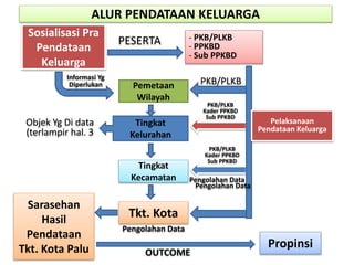 Dokumen ini menjelaskan alur pendataan keluarga mulai dari sosialisasi, pemetaan wilayah, pelaksanaan pendataan, hingga pengolahan data. Pendataan dilakukan oleh kader dari tingkat kecamatan hingga kelurahan untuk mengumpulkan informasi mengenai jumlah anggota keluarga, pendidikan, kesehatan, keluarga berencana, dan tingkat kesejahteraan. Hasil pendataan akan diolah untuk keperluan perencanaan pemb