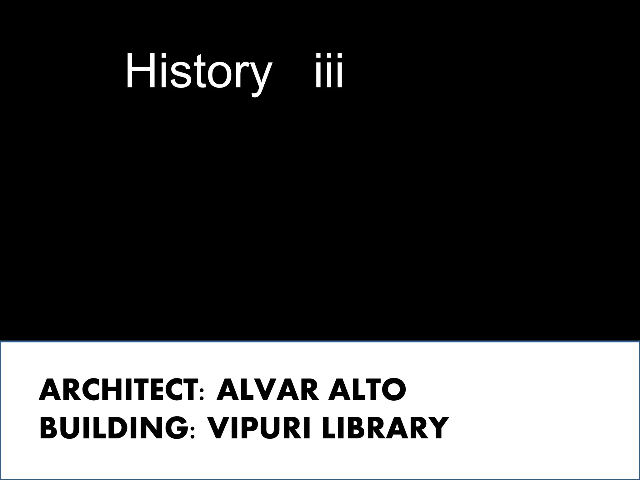 The document discusses the Vipuri Library designed by architect Alvar Aalto, located in Vyborg, USSR, built between 1927 and 1935. It highlights Aalto's architectural style, which evolved from neoclassicism to a unique blend of functionalism and expressionism, along with his focus on creating spaces that respond to site and materials. Additionally, the text outlines the library's design features, including varying reading levels and areas, as well as considerations for daylight, acoustics, and ventilation.