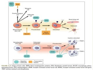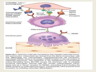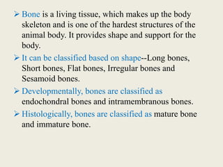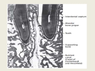 Bone is a living tissue that provides structure and support. It can be classified based on shape, development, histology, and composition. The alveolar process forms with tooth development and eruption to support teeth in the jaw. It consists of cortical and cancellous bone layers surrounded by osteoblasts and osteoclasts, which build and resorb bone through various signaling pathways and enzymes.