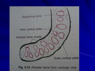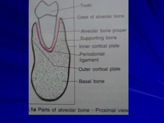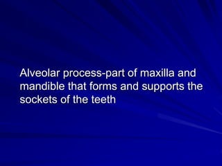 The alveolar process forms the sockets that house the roots of teeth. It has two parts - the alveolar bone proper which surrounds the roots, and the supporting alveolar bone which provides structure. The alveolar bone is remodeled throughout life as teeth erupt and resorb in response to forces. Periodontal disease can cause harmful resorption of the alveolar bone. After tooth loss, the residual alveolar ridge undergoes predictable resorption patterns over time.