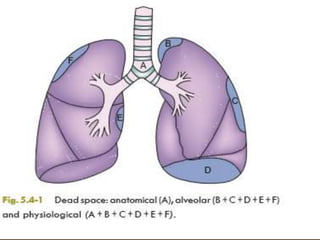 2) Dead space includes anatomical dead space in the conducting airways and alveolar dead space from non-functioning alveoli. Physiological dead space is the total dead space measured using Bohr's equation.