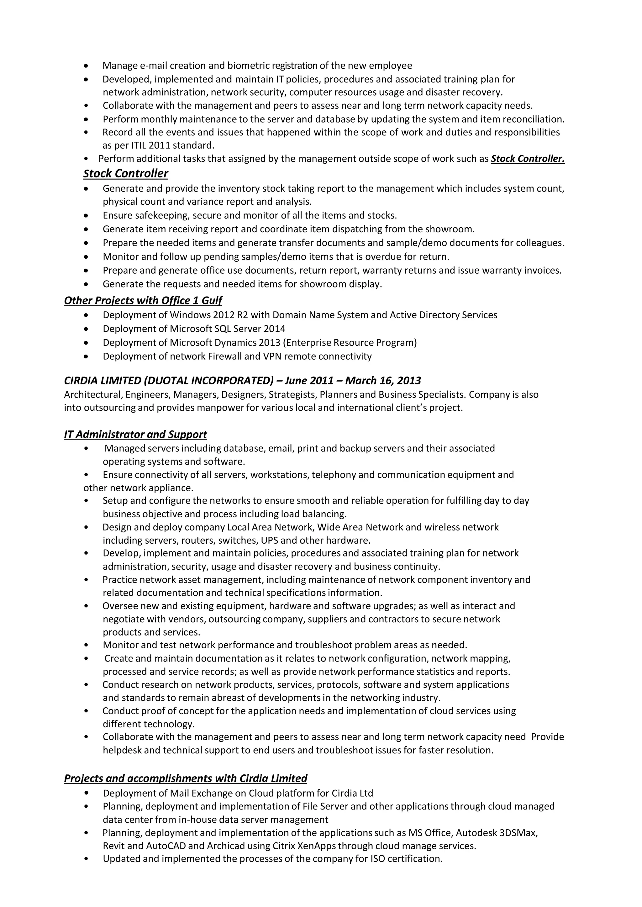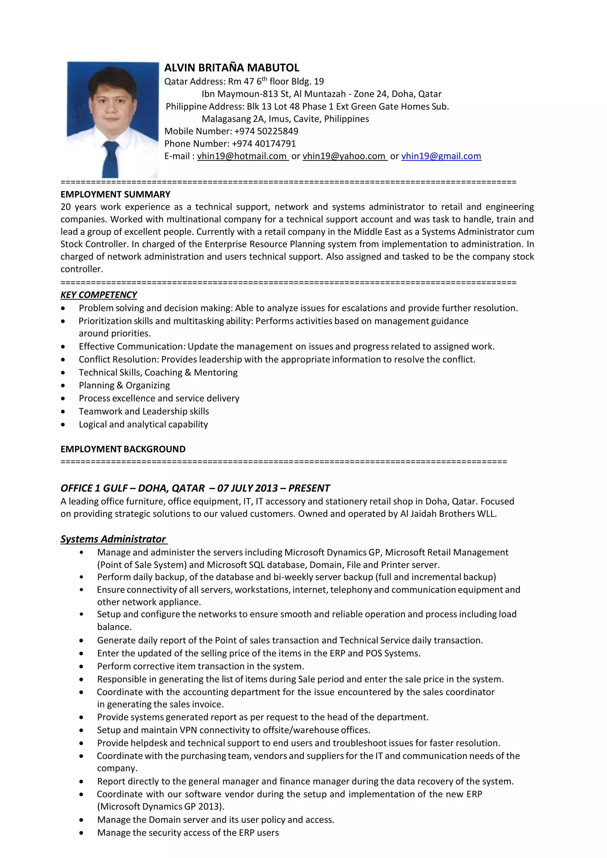 This document provides a summary of Alvin Britaña Mabutol's employment history and qualifications. He has over 20 years of experience in technical support, systems administration, and network administration for retail and engineering companies. His most recent role is as Systems Administrator and Stock Controller for a leading office furniture retailer in Qatar, where he manages their IT infrastructure and enterprise resource planning system. He also has experience in similar roles for other companies in Qatar and the Philippines.