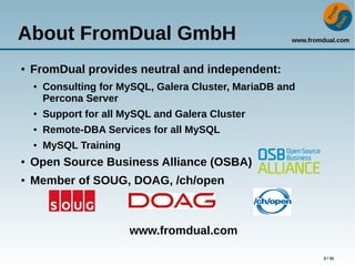 This document provides an overview of Galera Cluster for MySQL. It discusses how Galera Cluster allows for highly available, multi-master replication across multiple nodes through synchronous replication. It also covers topics like installation, configuration, operations including rolling restarts, load balancing, and catching node state changes. The document includes demonstrations of these concepts.
