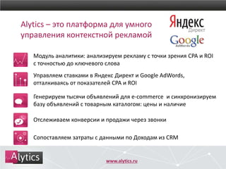 Документ описывает платформу alytics для управления контекстной рекламой, акцентируя внимание на важности сквозной аналитики для оптимизации затрат и увеличения ROI. Платформа предоставляет инструменты для анализа ключевых слов, отслеживания звонков и интеграции с CRM, что позволяет эффективно управлять рекламными кампаниями. Основное внимание уделяется методам сбора статистики и оптимизации ставок для повышения конверсий и снижения стоимости лида.