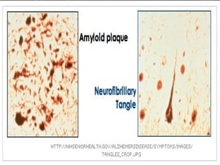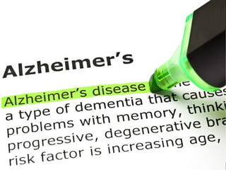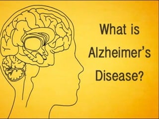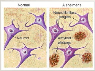 Alzheimer's disease, named after Dr. Alois Alzheimer, is a progressive disorder that leads to memory loss, cognitive decline, and behavioral changes due to neuron damage. There are two types of Alzheimer's: familial (affecting ages 30-60) and sporadic (occurring after age 65), characterized by beta-amyloid plaques and neurofibrillary tangles in the brain. While there is no cure, the FDA has approved medications to slow its progression and improve quality of life.