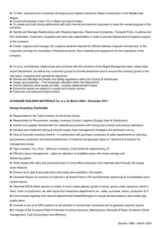 Ashok Mahadevan is a Supply Chain Manager based in Dubai with over 25 years of experience. He currently works for Mapei Construction Chemicals LLC, where he is responsible for procurement, inventory control, logistics and vendor management. Previously he held roles as Group Inventory Controller and Warehouse Supervisor. He has a Bachelor's Degree in Science from India and post-graduate diploma in Supply Chain Management.