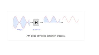 The document discusses the AM diode envelope detector. It describes how the diode detector detects the envelope of an AM signal using a diode and low-pass filter. The diode rectifies the signal, leaving only the positive or negative half. The filter then removes the high frequencies, leaving an audio signal. While simple and low-cost, the diode detector introduces distortion and has limited sensitivity. However, it remained widely used in radios due to its convenience and low price.